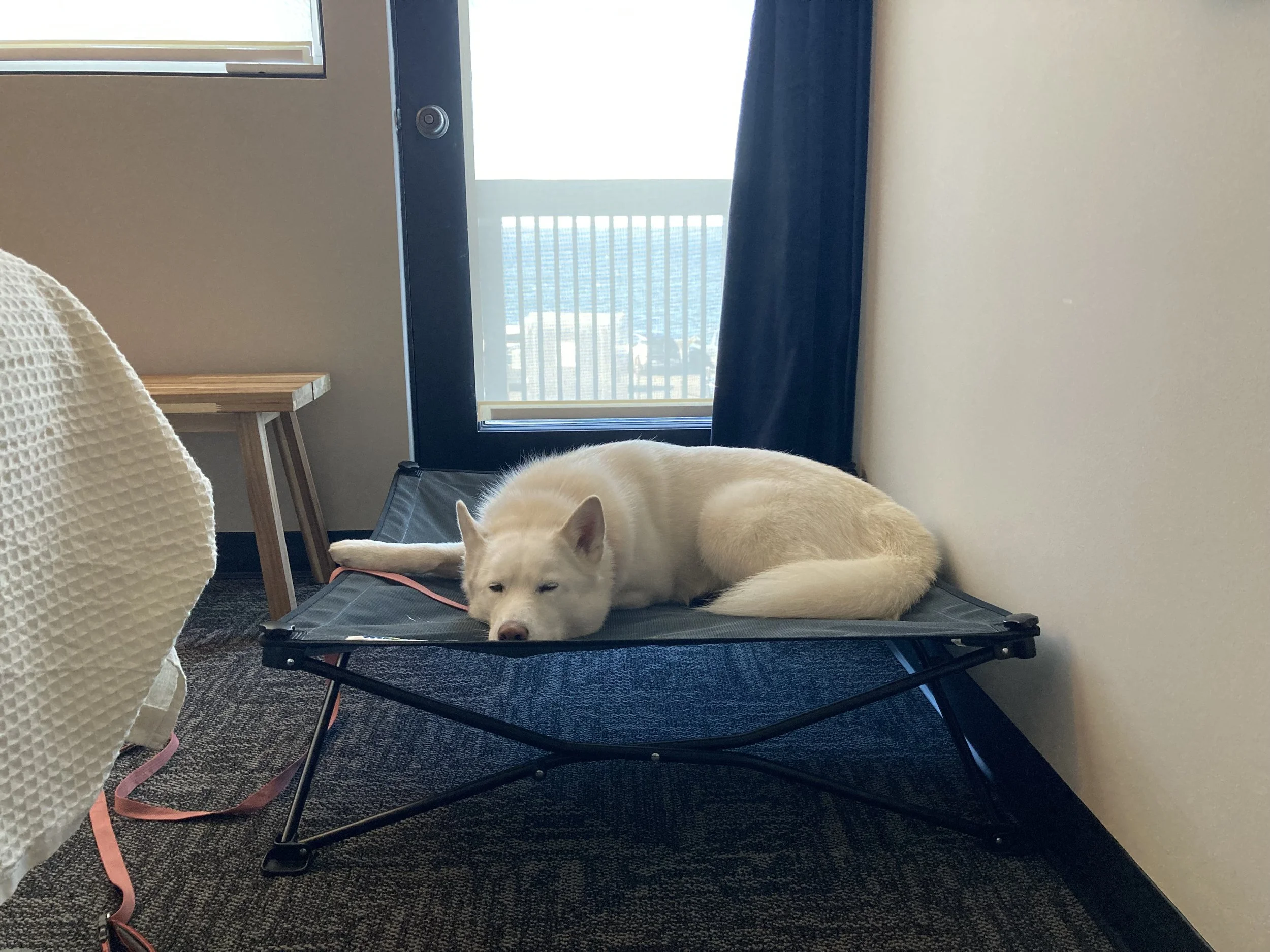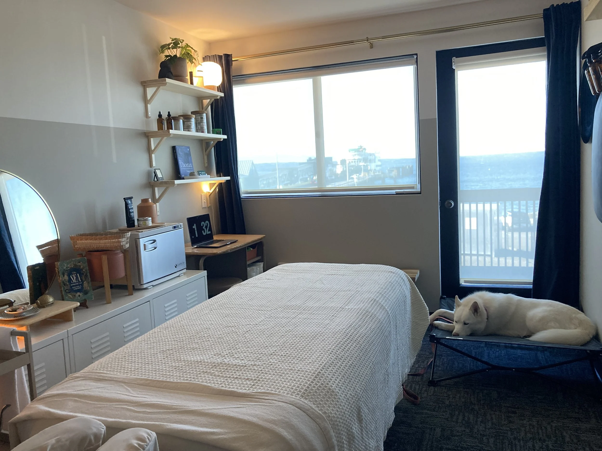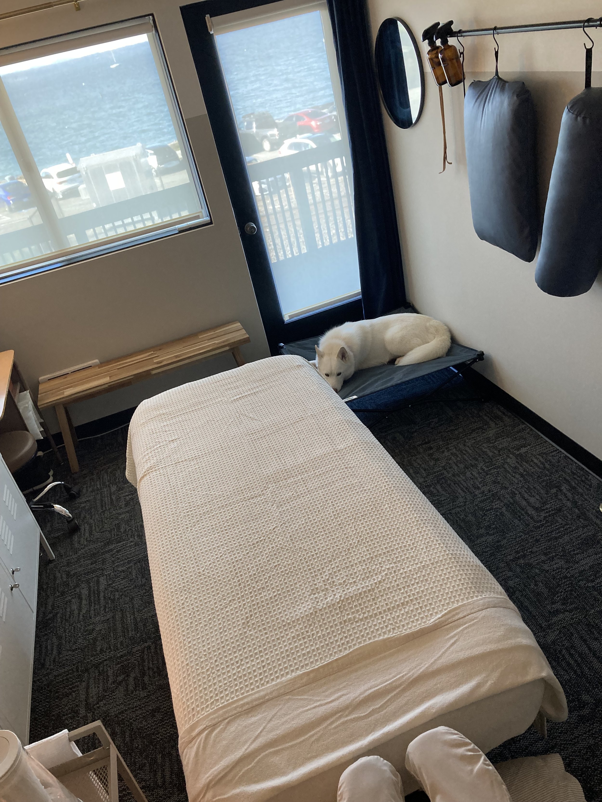 Asuka can return to her designated place or roam around the room while we chat about what you’re experiencing and how you’d like to use your time. She’ll leave the room with me while you get on the table.